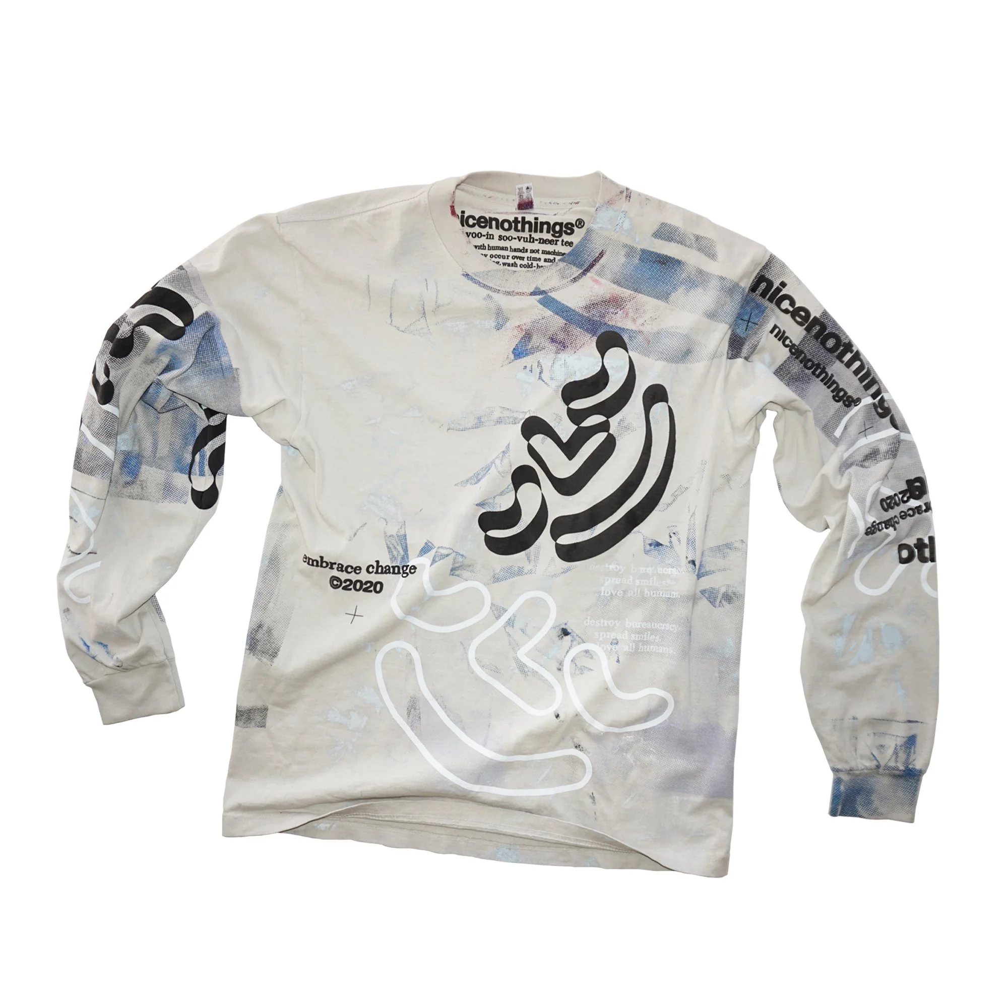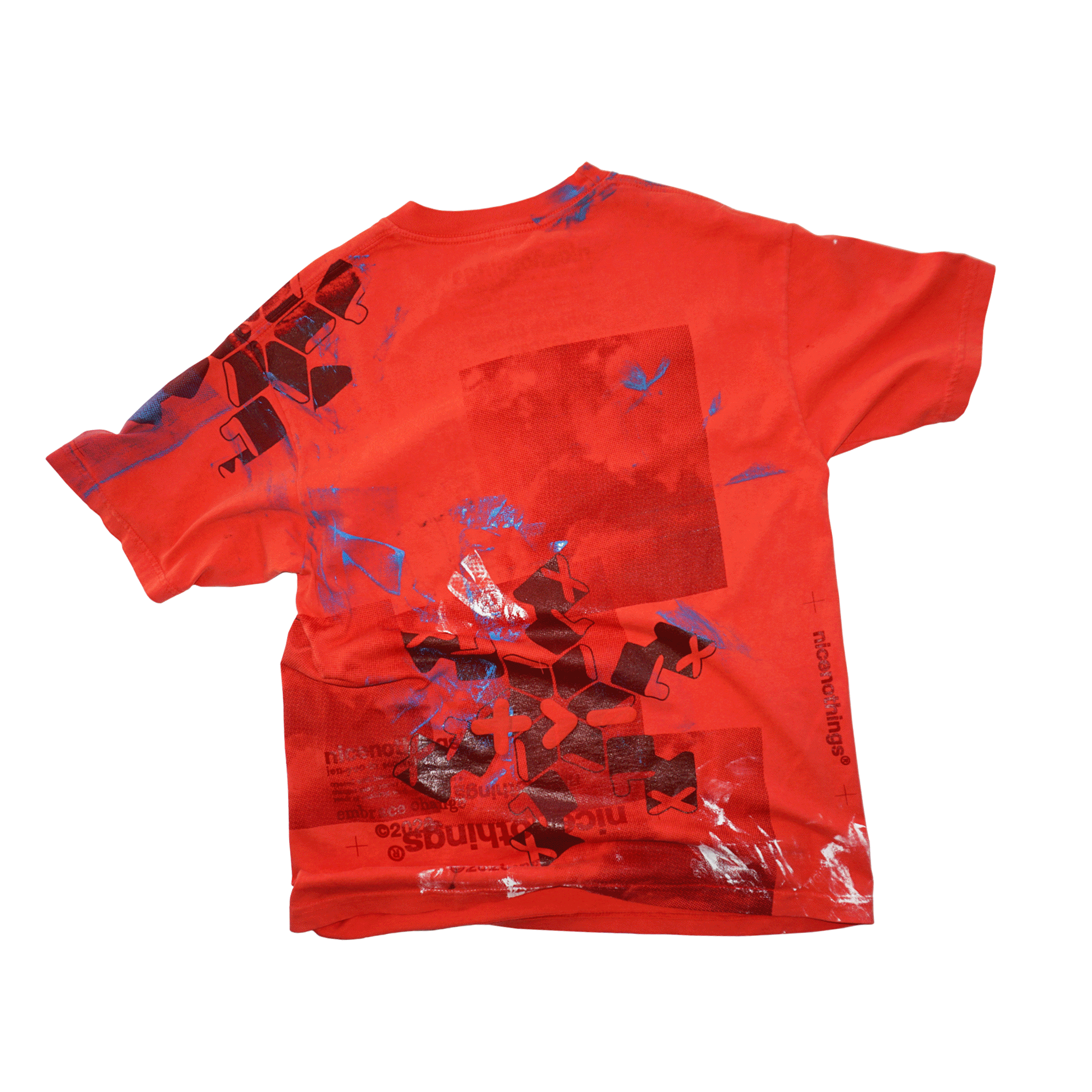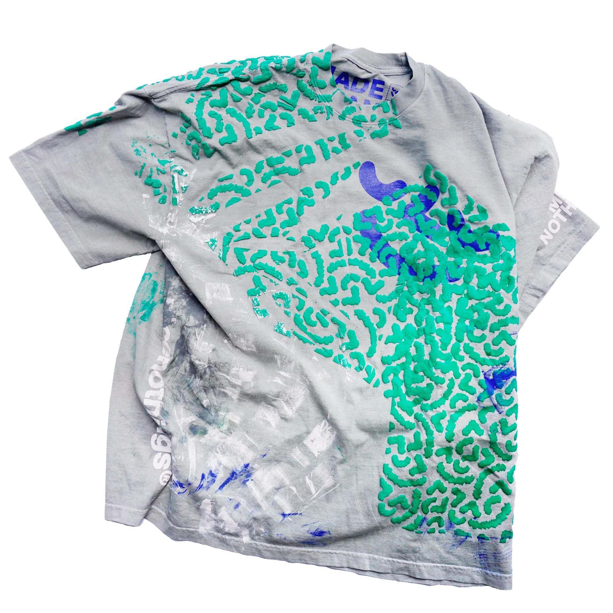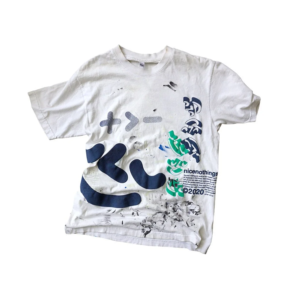 TEST PRINTS. some of them have seen super heavy action. others were sacrificed to keep the tools clean. there was zero intention to sell these at the start. the very first one was sold at a pop up in 2019. i had set up the racks with all these freshly printed teal and navy puff print long sleeves and at the bottom of the box i had these four shirts that looked completely thrashed(one of them i distinctly remember cleaning the studio floor with. the stains were incredible).i decided to hang them at the back of the rack with a $100 price tag. i REMEMBER thinking: theres no fucking way someone wants thIS shit. i was wrong. sold two of them right ofF the bat. i posted the other two up online and within minutes they were gone. one went off to japan the other ONE LIES STATESIDE.