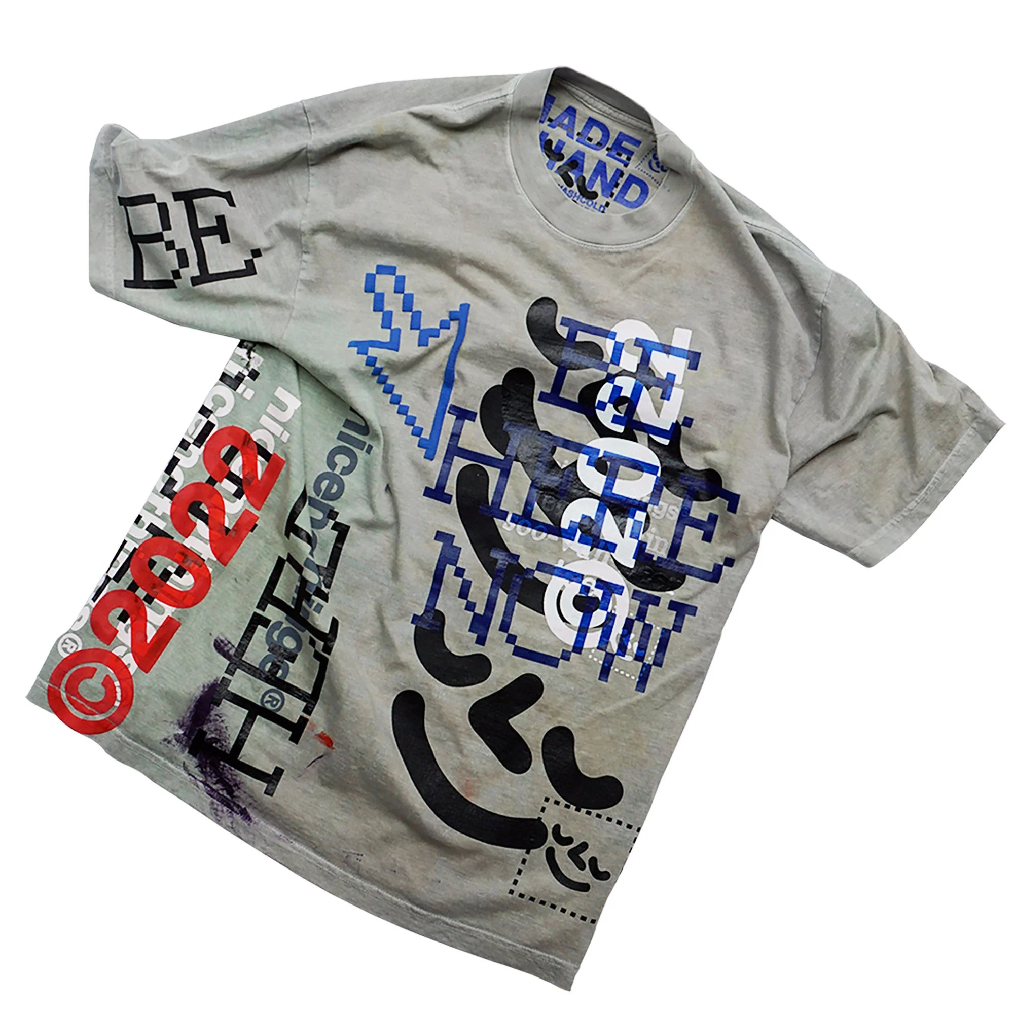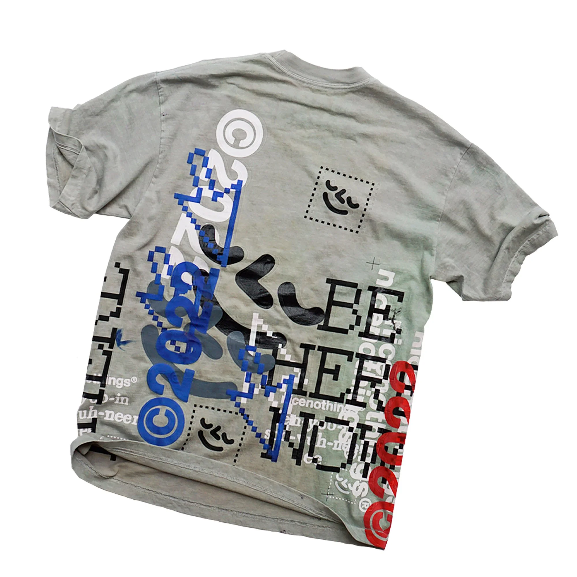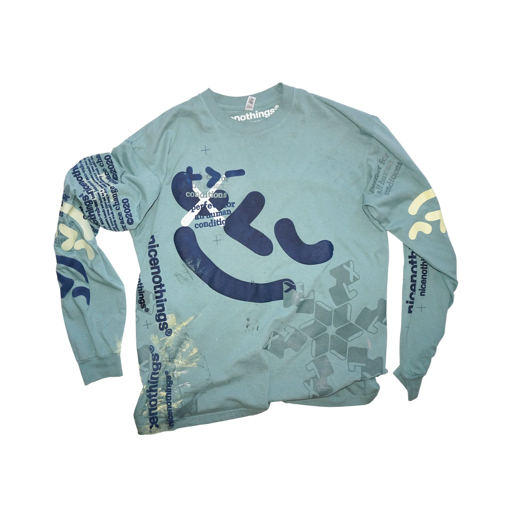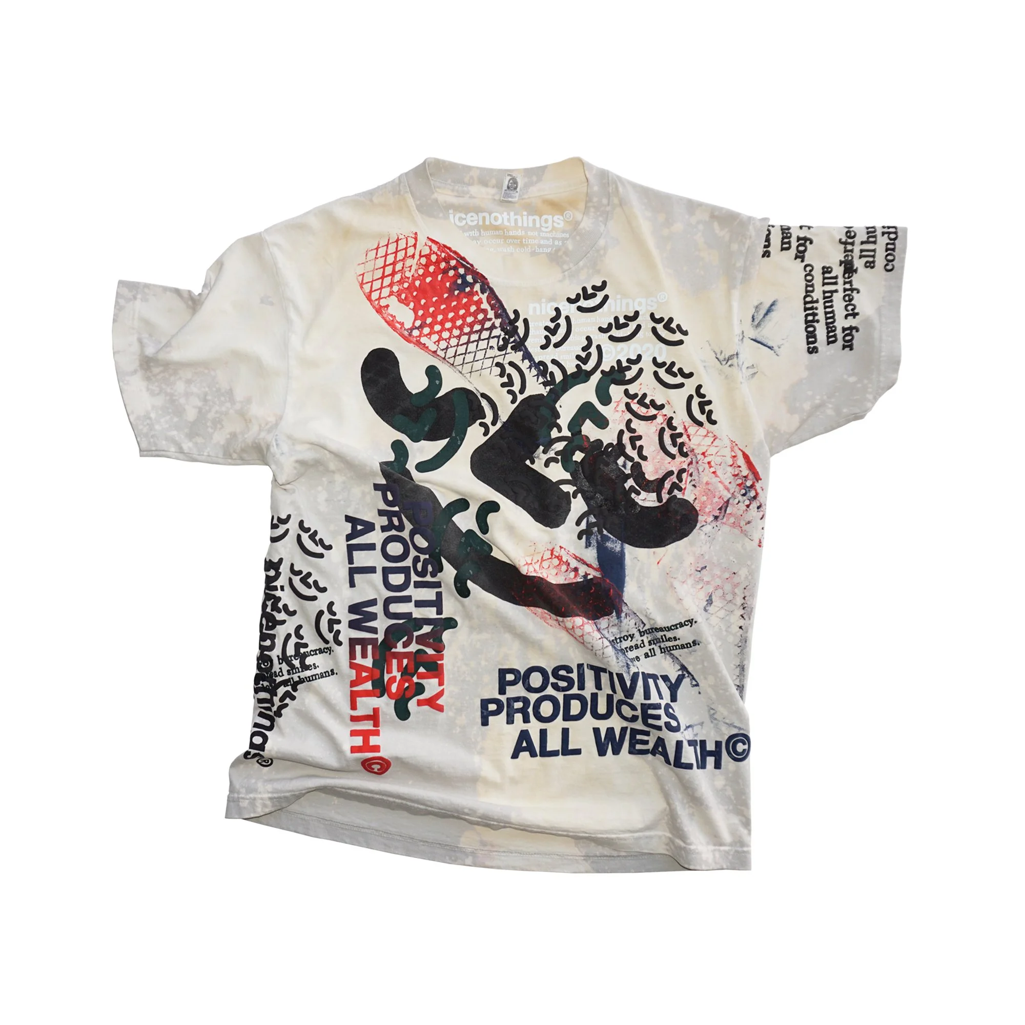 TEST PRINTS. some of them have seen super heavy action. others were sacrificed to keep the tools clean. there was zero intention to sell these at the start. the very first one was sold at a pop up in 2019. i had set up the racks with all these freshly printed teal and navy puff print long sleeves and at the bottom of the box i had these four shirts that looked completely thrashed(one of them i distinctly remember cleaning the studio floor with. the stains were incredible).i decided to hang them at the back of the rack with a $100 price tag. i REMEMBER thinking: theres no fucking way someone wants thIS shit. i was wrong. sold two of them right ofF the bat. i posted the other two up online and within minutes they were gone. one went off to japan the other ONE LIES STATESIDE.